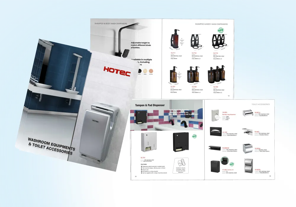 Hotec has developed a variety of washroom equipments ranging from hand dryers, hair dryers, soap dispensers, paper dispensers, etc. for your selection.Kindly discover our professional hygiene products...