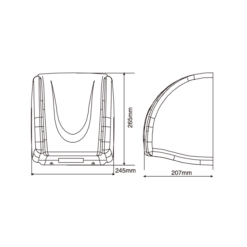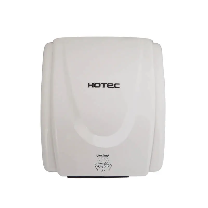 HOTEC infared sensor hand dryer, one-piece cover, durable and antirust. Made of ABS plastic with white finish. Easy installation and maintenance. High speed brush motor incorporating a safety thermal cut-off.