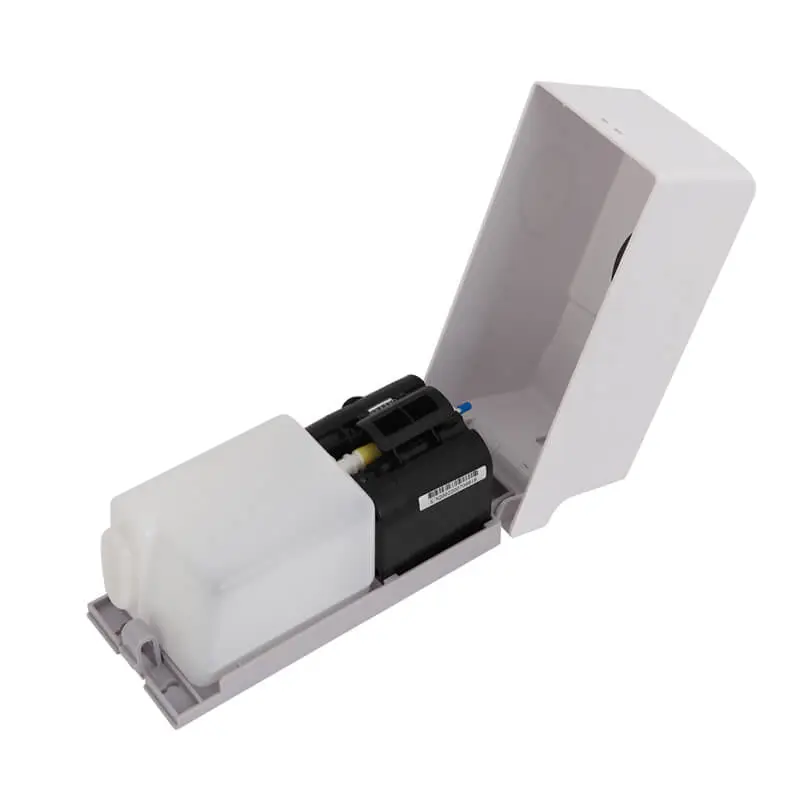 Hand-free Liquid Soap Dispenser. ABS white finish 3.0mm thickness. Long lasting strength, security lock with standard key to prevent stealing. Flashing LED for battery change.