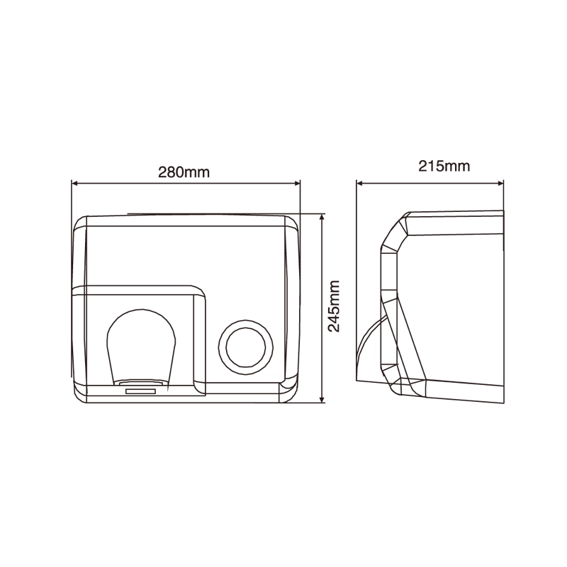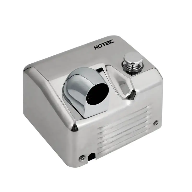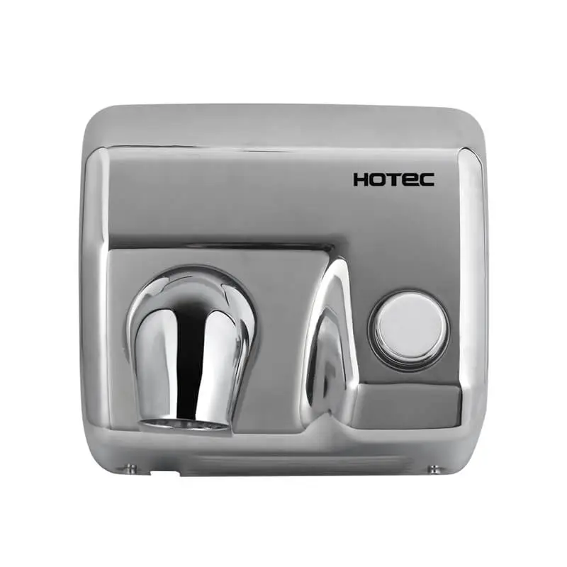 HOTEC hiflow plus push button hand dryer, silver bright finish. Modern classic look, suitable for any style of washrooms. High speed brush motor, drying fast. It is one-piece stainless steel cover, durability and anticorrosion.