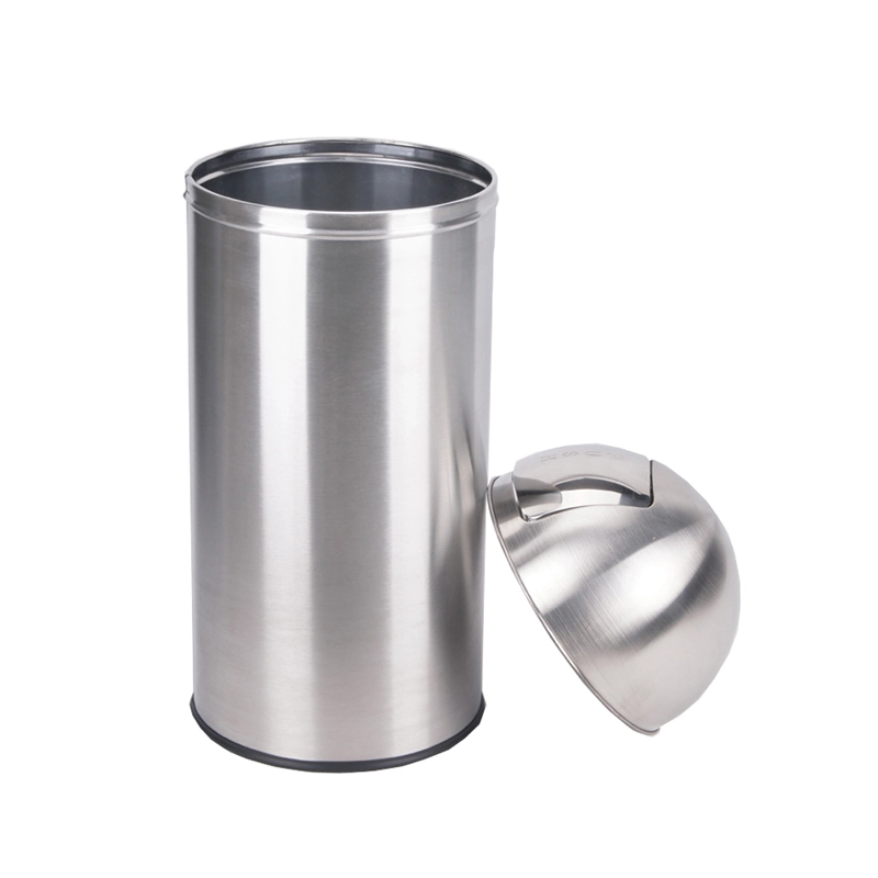Hotec stainless steel push round waste container bin, different capacity (18L, 25L or 50L) for option. Circular body with "Push" lid. Spring for automatic return and two impact and noise dampening rubber bumpers.