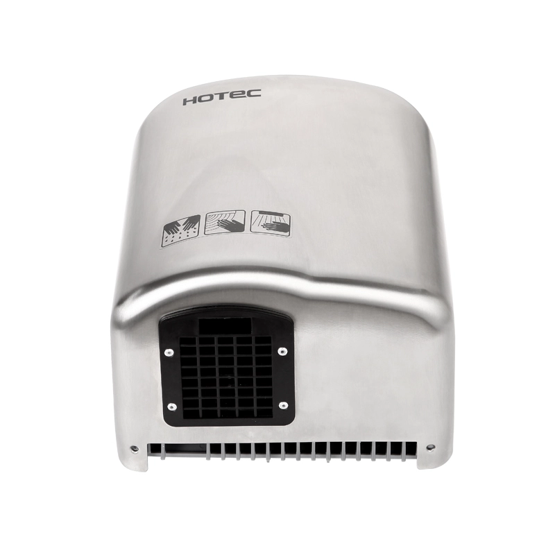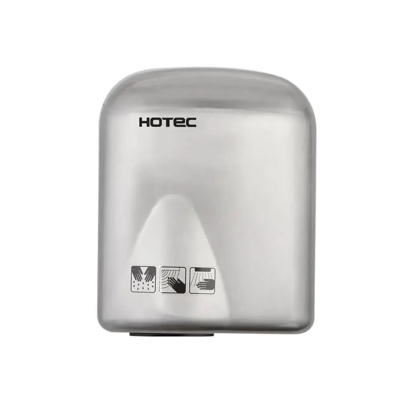 HOTEC touchless hand dryer made of 304 stainless steel with satin finish. Easy to install and maintenance.  It is one-piece cover, durability and antirusting including a safety thermal cut-off. High speed brush motor, drying fast.