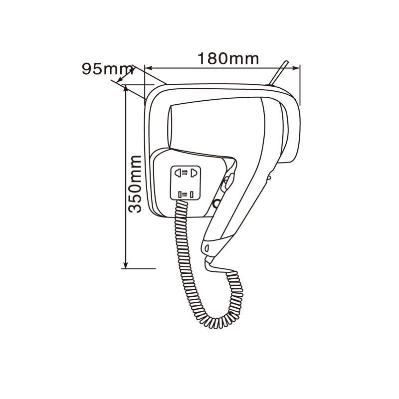 HOTEC hair dryer, wall mounting on wall, on and off switch. This compact and light weight hair dryer features warm air, two speed position and highest electrical safety. Classic modern design match many hotel buildings. The hair dryer hotel bathroom is perfect for any size bathroom and saving space.